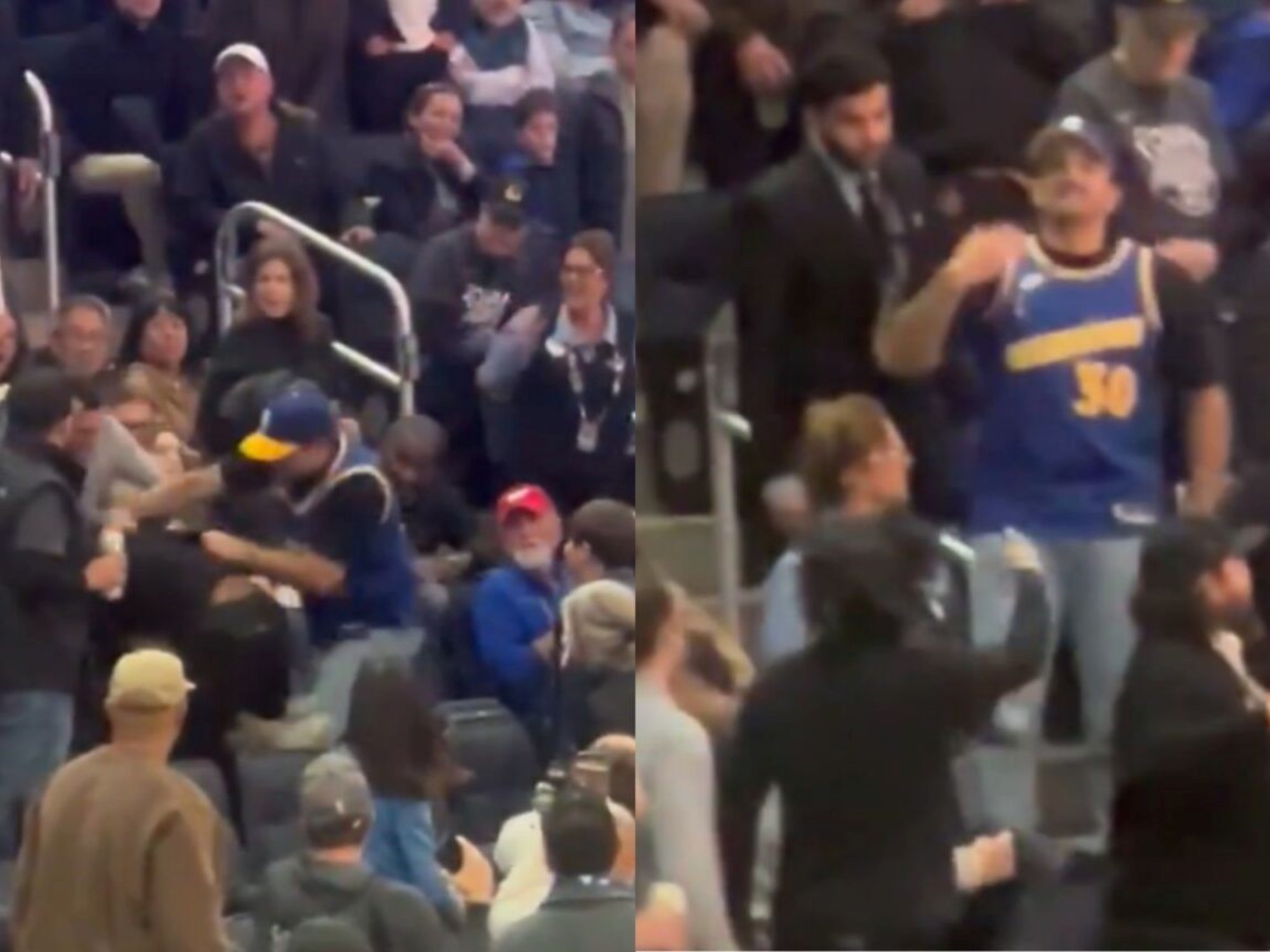 Una mujer en una sudadera gris intentó separar a los involucrados, pero terminó arrastrada al tumulto. Un buen samaritano trató de proteger al agredido y bloquear los ataques, pero el fan de Curry siguió lanzando puños antes de alejarse. La pelea se extendió hasta las escaleras, con ambos hombres intercambiando gritos e insultos inaudibles en el video, mientras el resto de la multitud observaba y grababa con sus celulares.